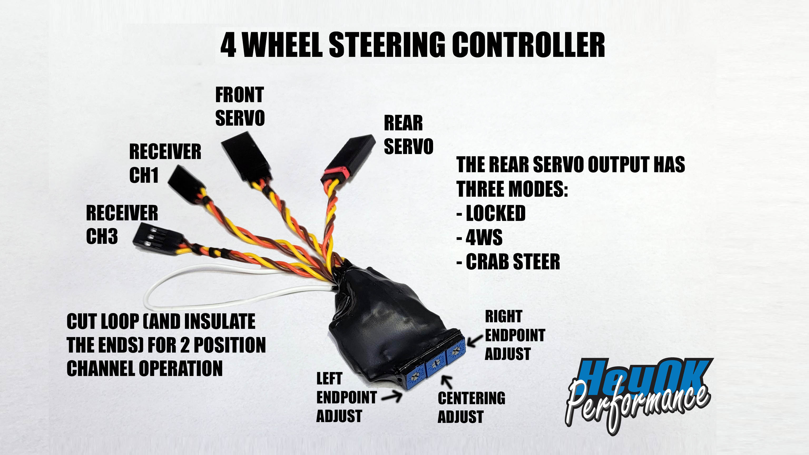 Compact controller that adds true linear rear-wheel steering to 2 or 3-position CH3 radio setups. Convert a simple three-channel transmitter into a four-wheel or crab-steer rig without rewiring your transmitter or adding extra channels.